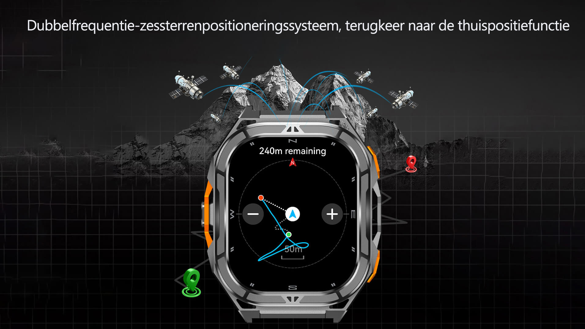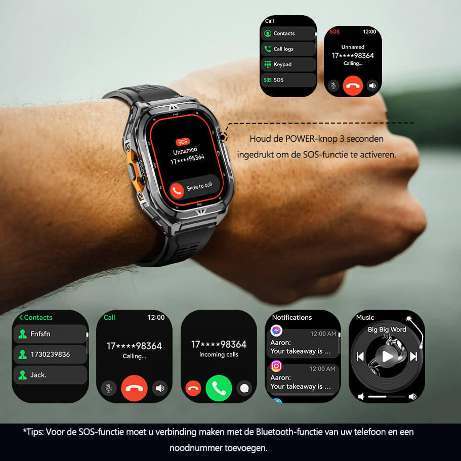 Ingebouwde SOS-noodfunctie waarmee je met één druk op de knop een noodsignaal kunt verzenden in kritieke momenten. Je kunt ook Bluetooth-gesprekken voeren, meldingen controleren, muziek afspelen en meer—altijd en overal.
